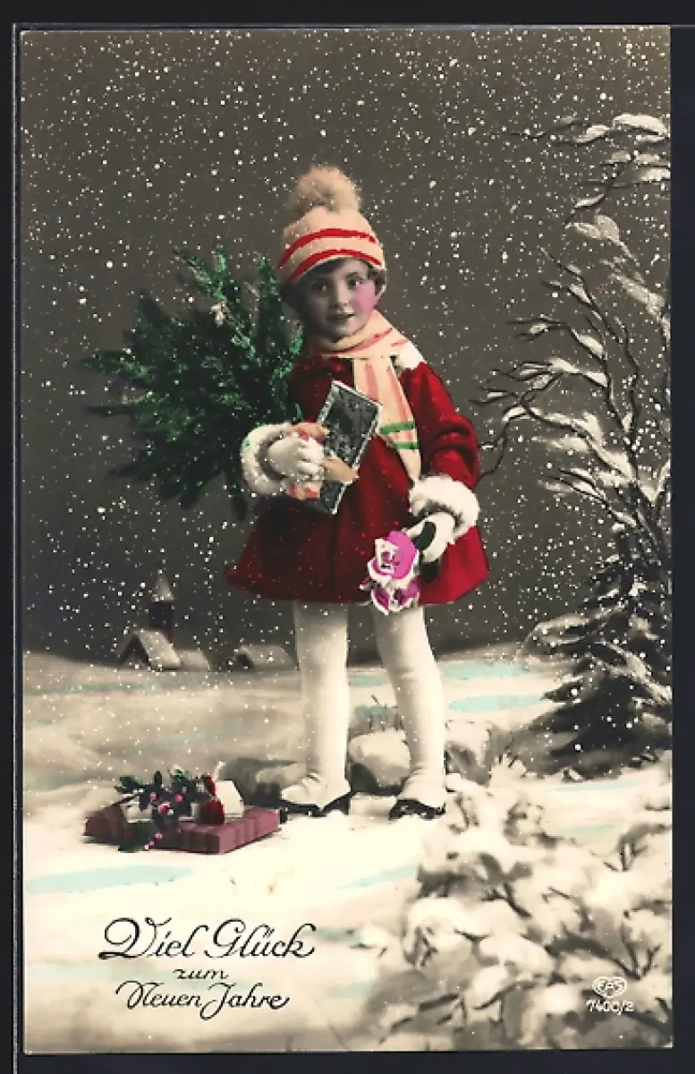 Foto-AK EAS Nr. 7400/2: Kind mit Tannenbaum bei Schneefall, Neujahrsgruss