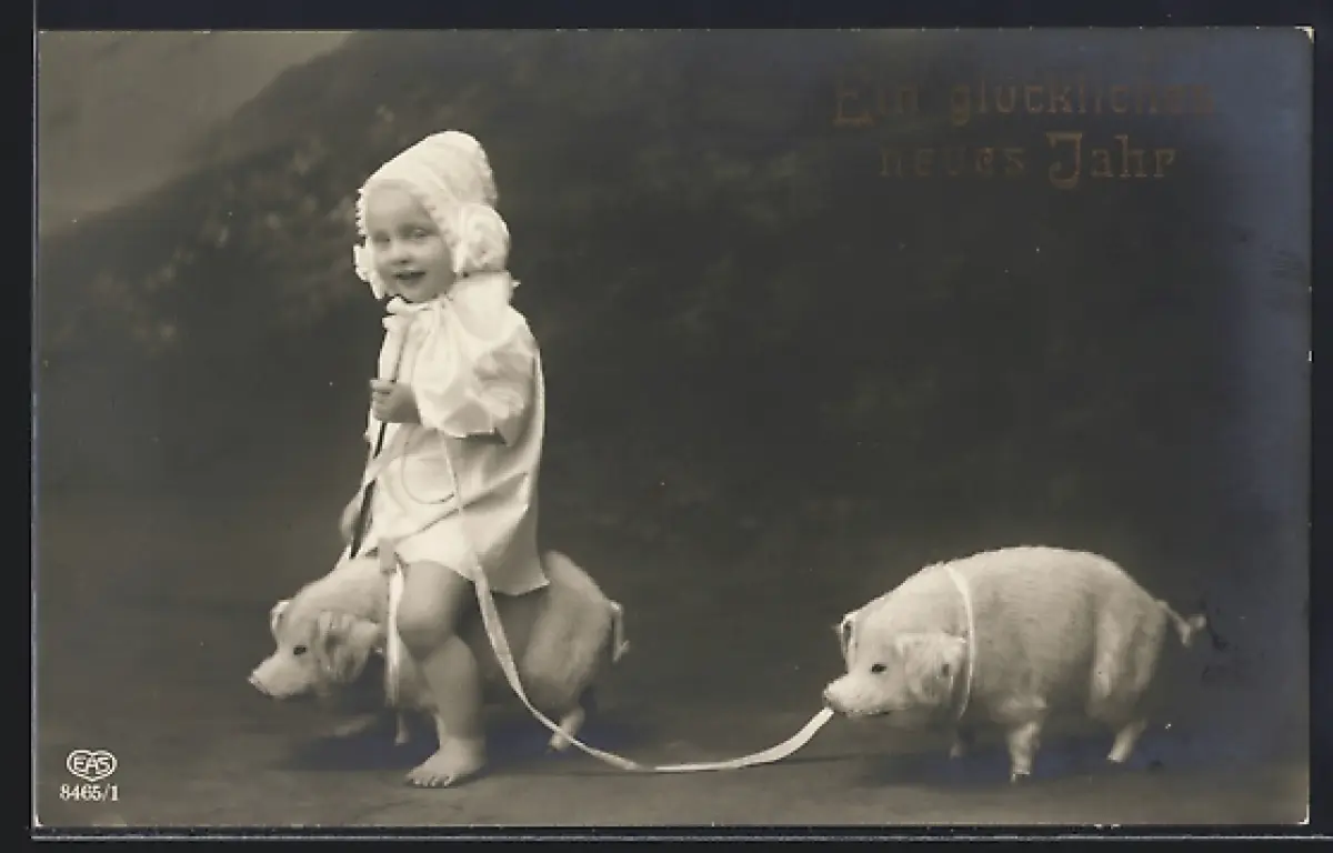 Foto-AK EAS Nr. 8465/1: Kleines Kind mit Plüschferkeln, Neujahrsgruss