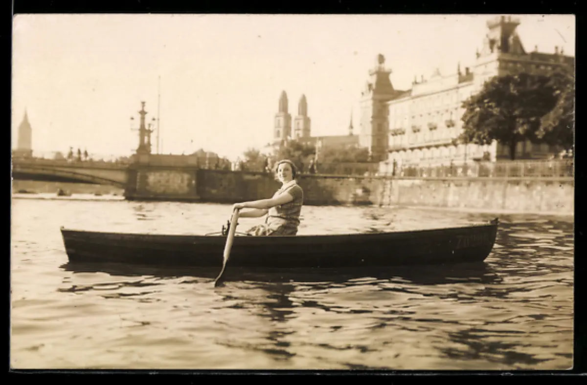 Foto-AK Frau in einem Ruderboot, Im Hintergrund Kirche