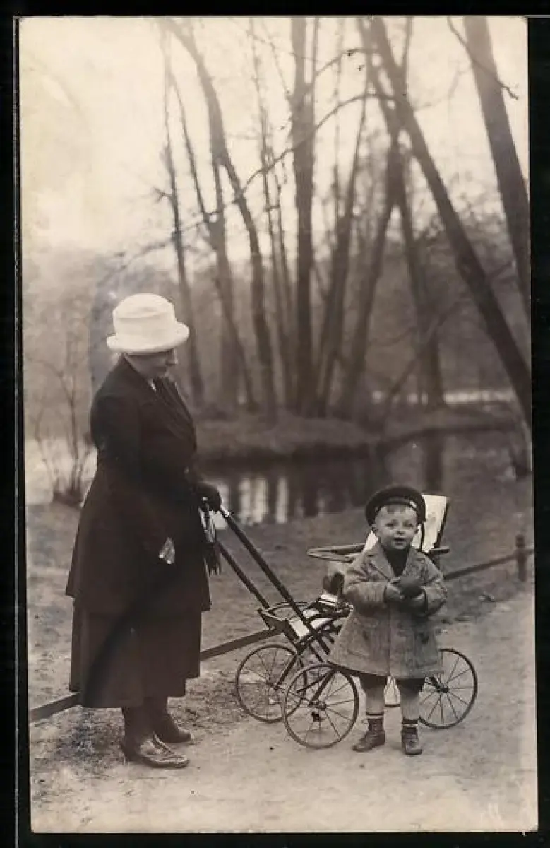 Foto-AK Frau mit Kinderwagen und einem Jungen mit Mütze