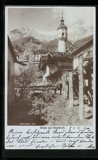 Foto-AK Fritz Gratl: Innsbruck, Hötting, Partie in Hötting mit Turm