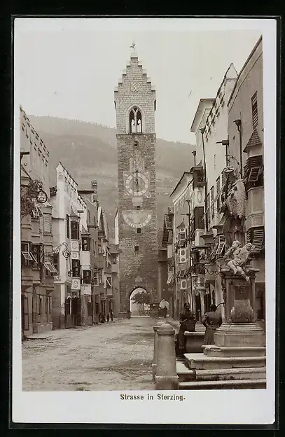 Foto-AK Fritz Gratl: Sterzing, Strasse in Sterzing mit Statue und Turm