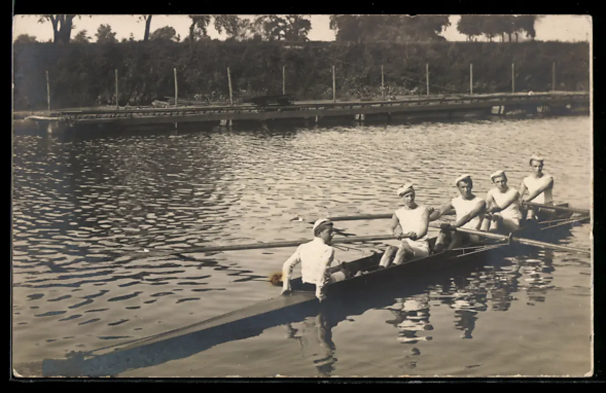 Foto-AK Fünf Sportler in einem Ruderboot