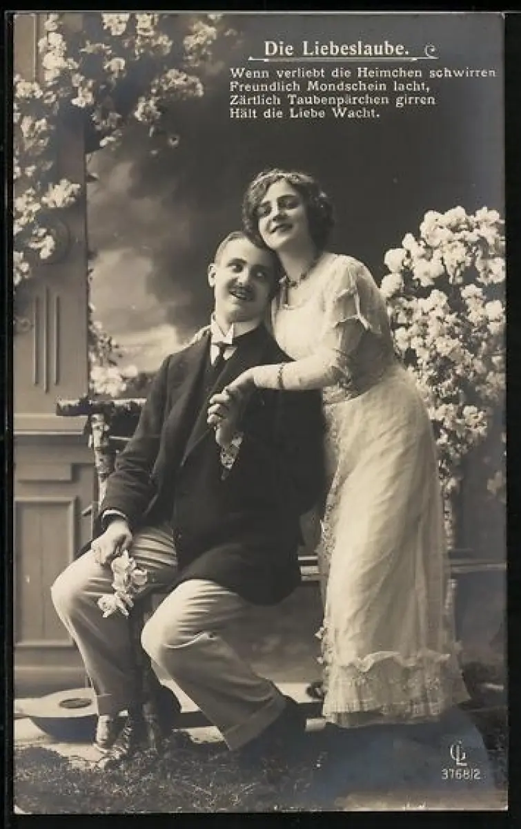 Foto-AK GL Co Nr. 3768/2: Liebespaar auf einer Bank, Die Liebeslaube