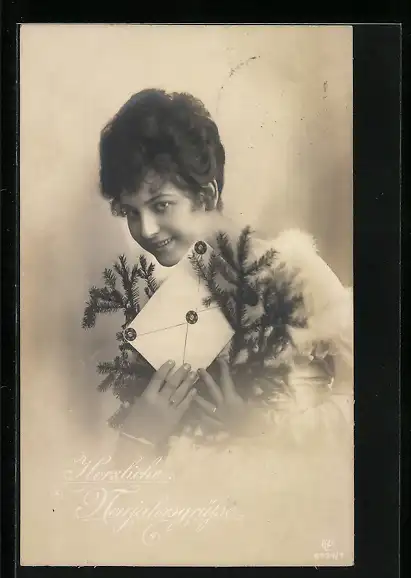 Foto-AK GL Co Nr. 6424 /1: Junge Frau mit Tannenzweigen und einem Brief