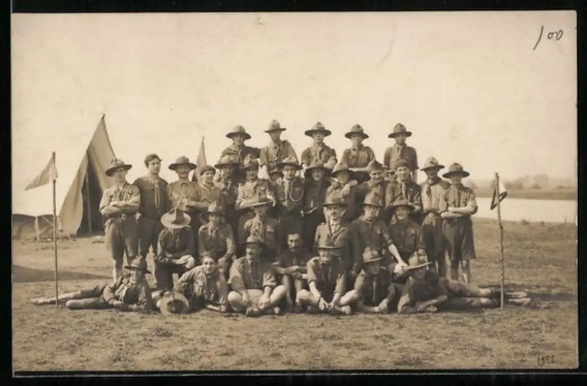 Foto-AK Gruppenbild von Pfadfindern, Camping
