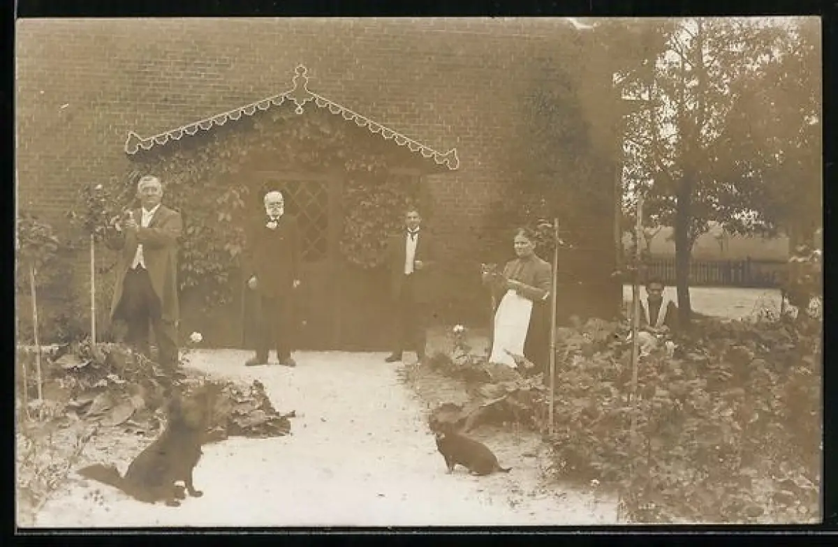 Foto-AK Hartwigswaldau /Sagan, Anwohner mit Hunden in einem Garten