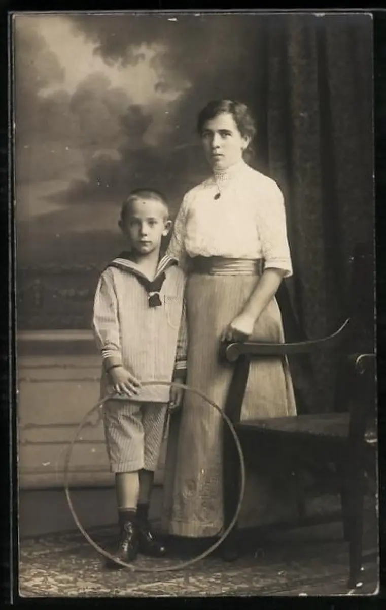 Foto-AK Junge Frau und Junge mit Spielzeug-Reifen