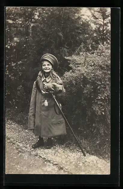 Foto-AK Junges Mädchen in der Uniform und mit dem Degen ihres Vaters, Kinder Kriegspropaganda