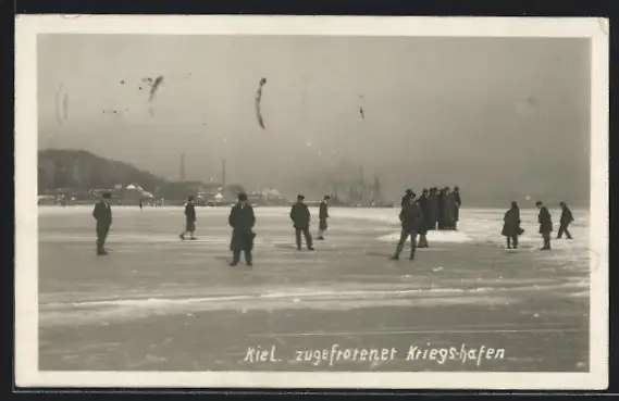 Foto-AK Kiel, Menschen auf dem zugefrorenen Kriegshafen