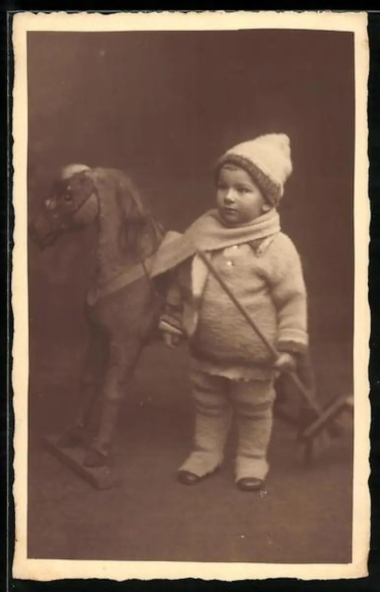 Foto-AK Kind in Winterkleidung mit einem Schaukelpferd