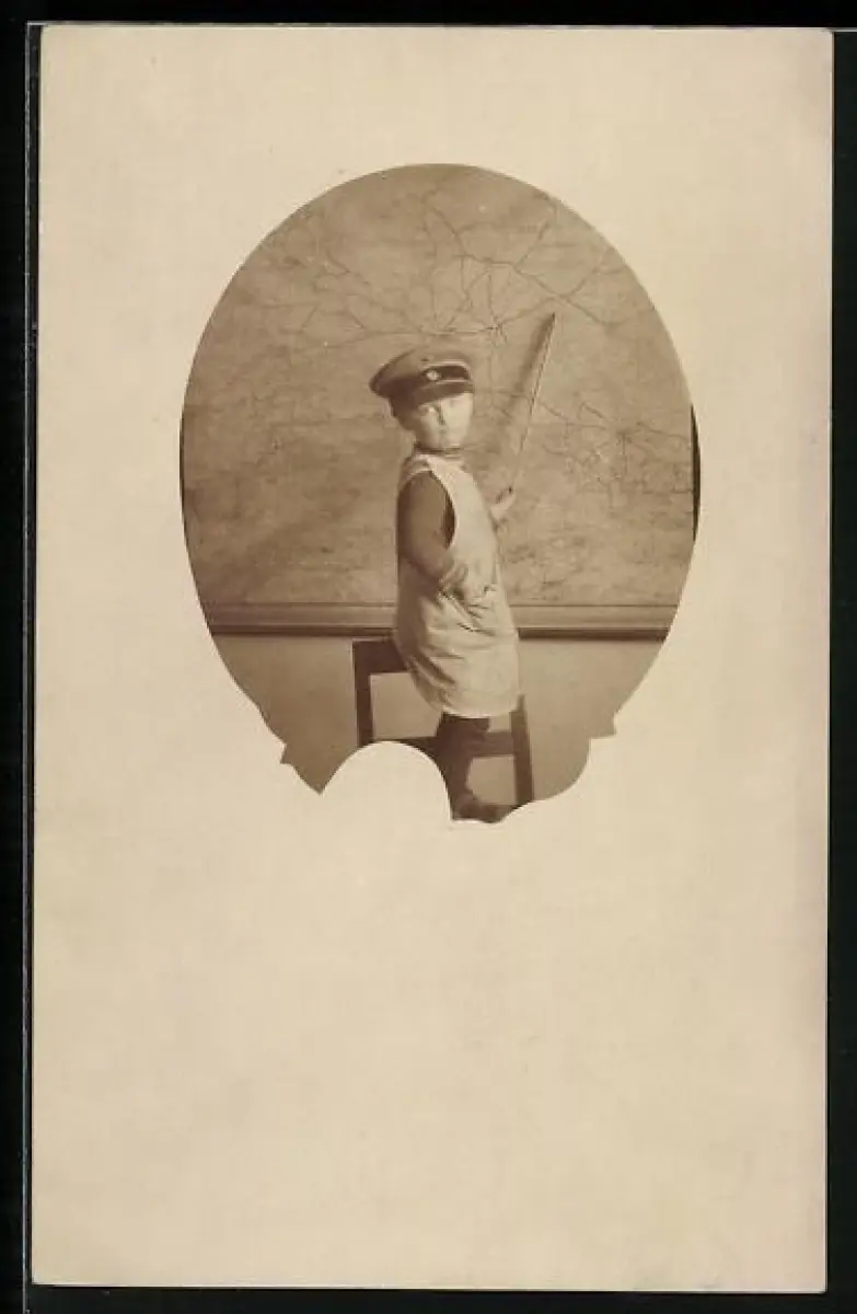 Foto-AK Kinder Kriegspropaganda, Kleiner Junge in Uniform an einer Landkarte
