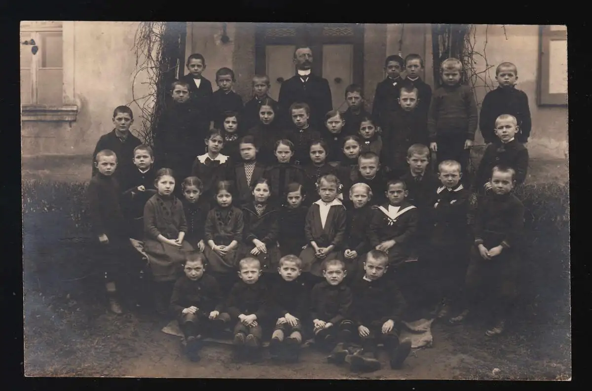 Foto AK, Kinder Schule Schulklasse Lehrer vor Schulgebäude, ungebraucht