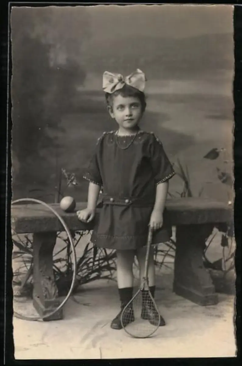 Foto-AK Kleines Mädchen mit Tennisschläger und Spielzeug-Reifen