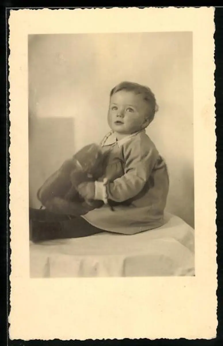 Foto-AK Kleinkind sitzt mit einem Teddy auf einem Tisch
