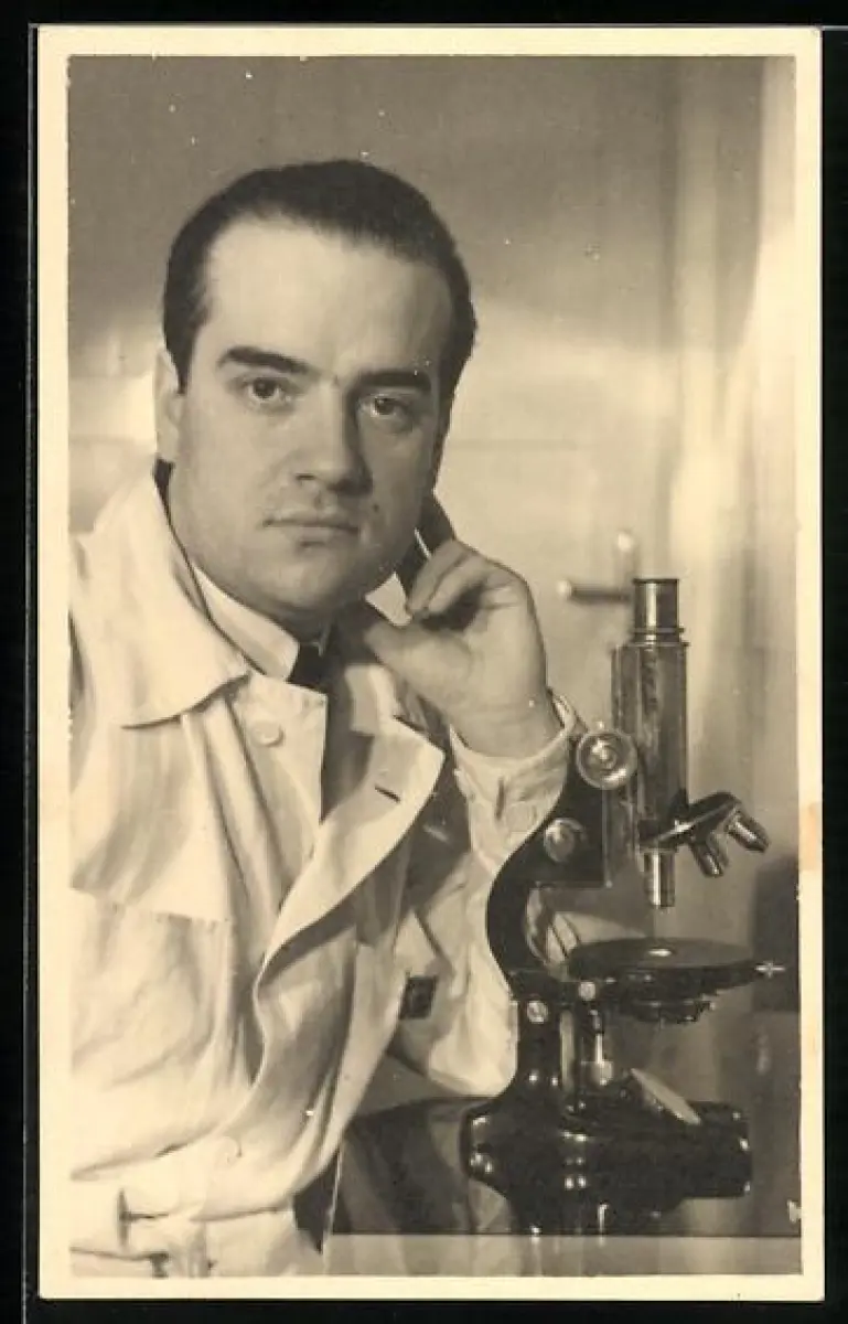Foto-AK Laborant mit Mikroskop im Porträt 1940