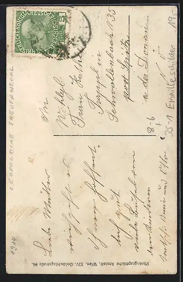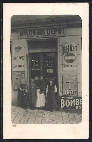Foto-AK Milch-Depot von Leopoldine Theuerweckl, Reklame auf Emailleschildern