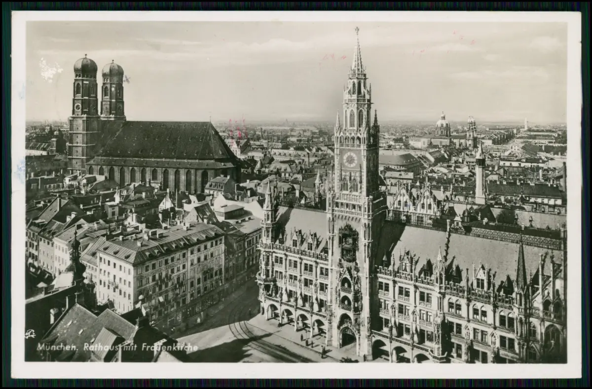 München – eindrucksvolle Stadtansicht mit dem Neuen Rathaus am Marienplatz und der Frauenkirche im Hintergrund. Das Foto zeigt die Innenstadt mit vielen architektonischen Details im Stil der frühen Nachkriegszeit. Verlag: A. Lengauer, München.