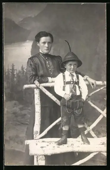 Foto-AK Mutter und Söhnchen in Tracht in Studiokulisse