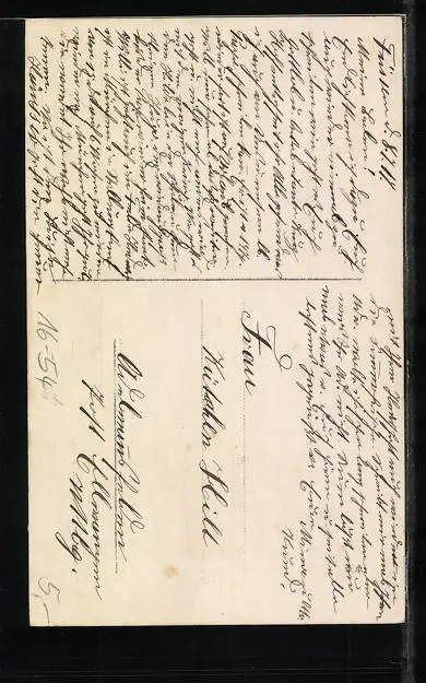 Personenbezogene Daten auf der Rückseite der Karte wurden durch blauen Textmarker unkenntlich gemacht. Die blauen Stellen sind auf die Vorderseite durchgeweicht und wirken sich negativ auf das Postkartenfoto aus