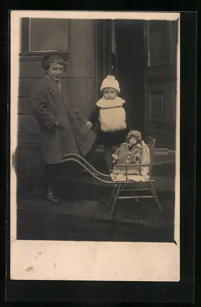 Foto-AK Mutter und Tochter mit Puppe im Schiebestuhl /Kinderwagen