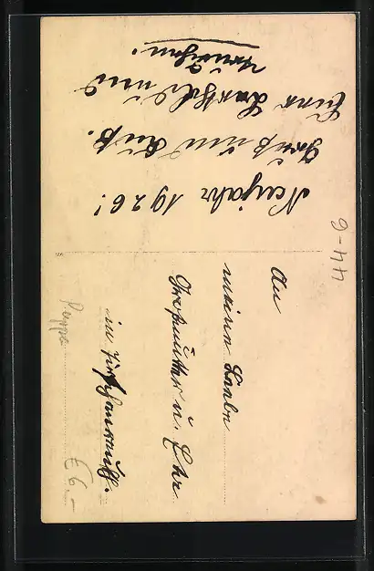 Personenbezogene Daten auf der Rückseite der Karte wurden durch blauen Textmarker unkenntlich gemacht. Die blauen Stellen sind auf die Vorderseite durchgeweicht und wirken sich negativ auf das Postkartenfoto aus