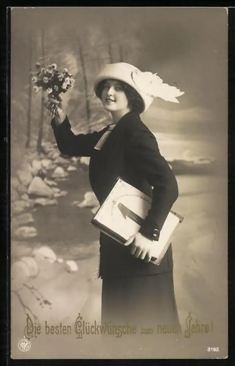 Foto-AK NPG Nr. 3182: Fräulein mit Blumenstrauss und Kalender, Neujahrsgruss