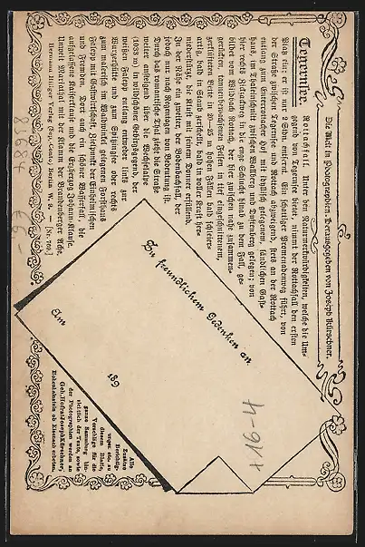 Personenbezogene Daten auf der Rückseite der Karte wurden durch blauen Textmarker unkenntlich gemacht. Die blauen Stellen sind auf die Vorderseite durchgeweicht und wirken sich negativ auf das Postkartenfoto aus