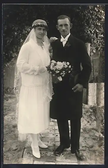 Foto-AK Neu verheiratetes Brautpaar im Freien