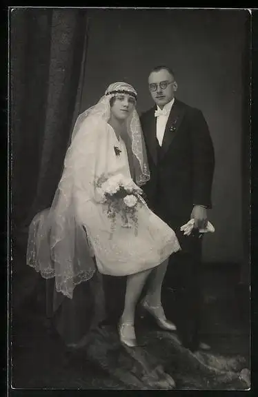 Foto-AK Paar in Hochzeitskleidung mit Blumenstrauss