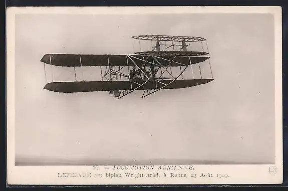 Foto-AK Pilot Lefebure in seinem Wright Ariel Doppeldecker über Reims 1909