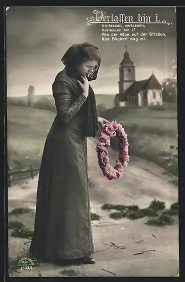 Foto-AK R & K / L Nr. 4899/1: Trauernde Frau mit Blumenkranz in der Hand, Verlassen bin i