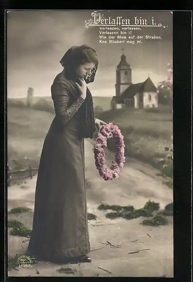 Foto-AK R & K / L Nr. 4899/1: Trauernde Frau mit Blumenkranz in der Hand, Verlassen bin i