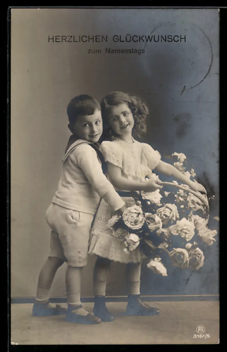 Foto-AK RPH Nr. 3161/5: Zwei Kinder mit einem Korb voller Rosen