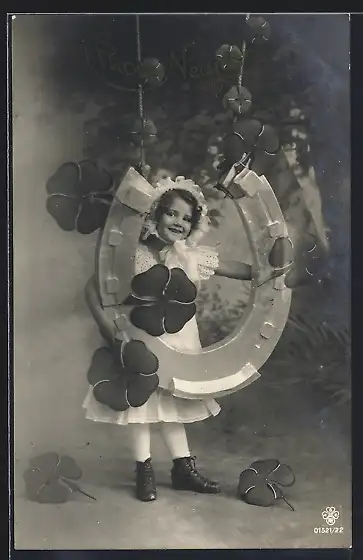 Foto-AK RPH SBW: Kleines Mädchen mit riesigem Hufeisen und Kleeblättern