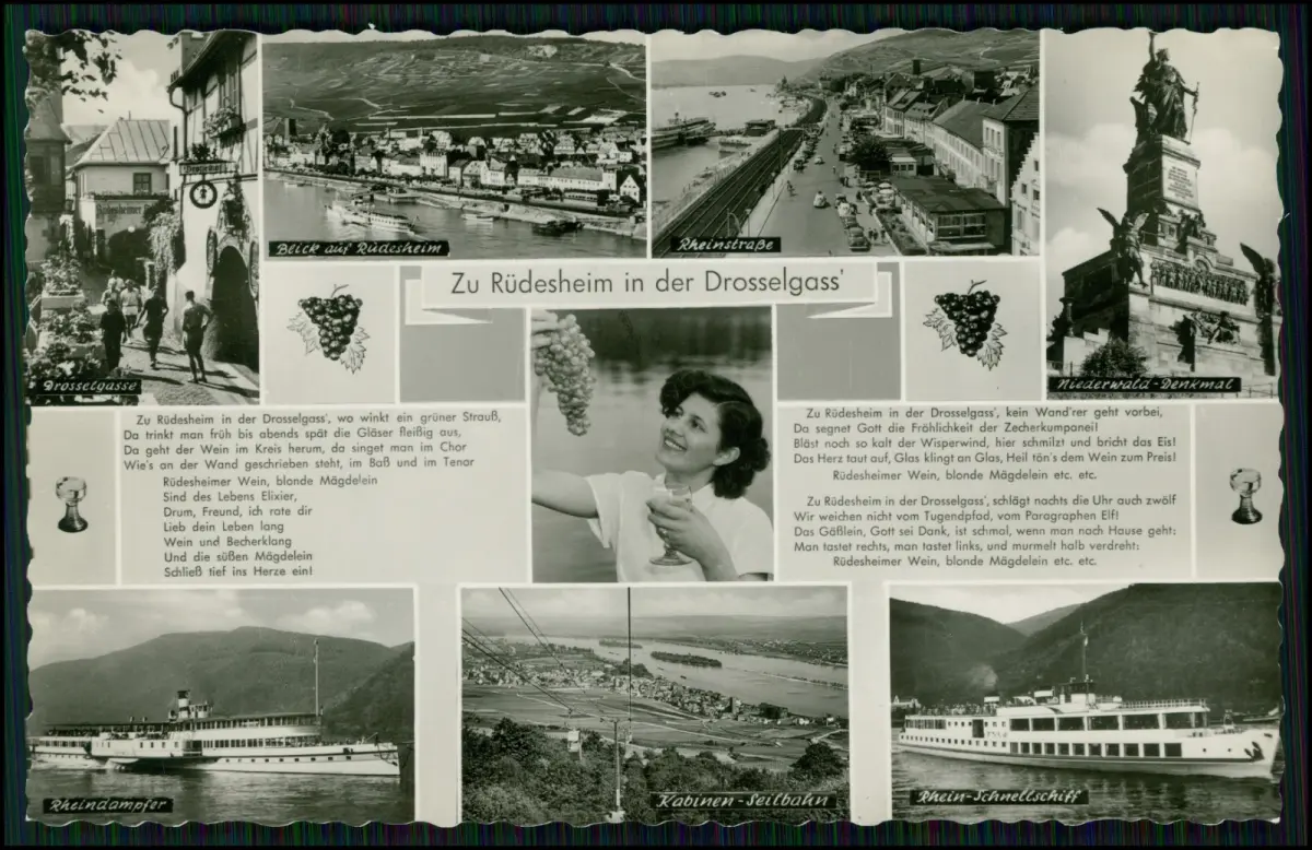 Mehrbild Echt Foto Druck mit typischen Motiven aus Rüdesheim am Rhein. Darstellung von Drosselgasse, Blick auf Rüdesheim, Rheinstraße, Niederwalddenkmal, Rheindampfer, Rhein Schnellschiff sowie Kabinen Seilbahn. Ergänzt durch zeittypische Bildgedichte zum Rüdesheimer Wein. Klassische touristische Gesamtkomposition der Nachkriegszeit.