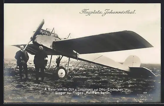Foto-AK Sanke Nr. 192: Berlin-Johannisthal, A. Baierlein mit Oblt. v. Linsingen auf Otto-Eindecker