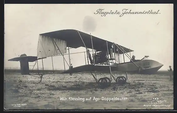Foto-AK Sanke Nr. 193: Berlin-Johannisthal, Flughafen, Wilh. Kiessling auf Ago-Doppeldecker