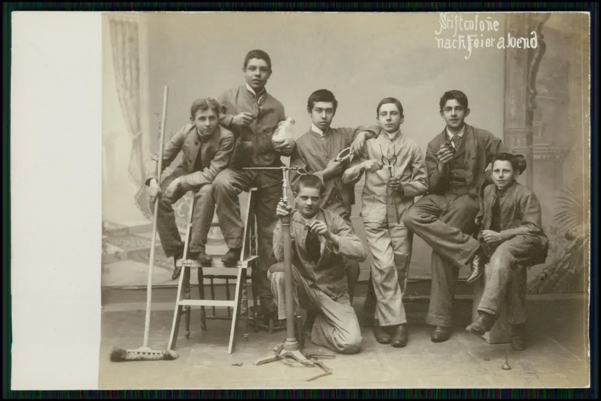 Foto AK - Stiftcolone nach Feierabend - Handwerks-Lehrlinge in Arbeitskleidung