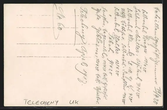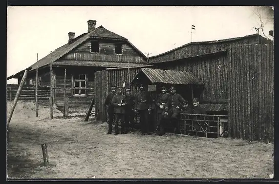 Foto-AK Telecheny, Soldaten in Uniform vor Holzhäusern