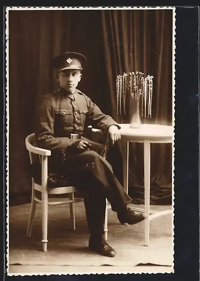 Foto-AK Tschechischer Soldat in Uniform nebst Tisch