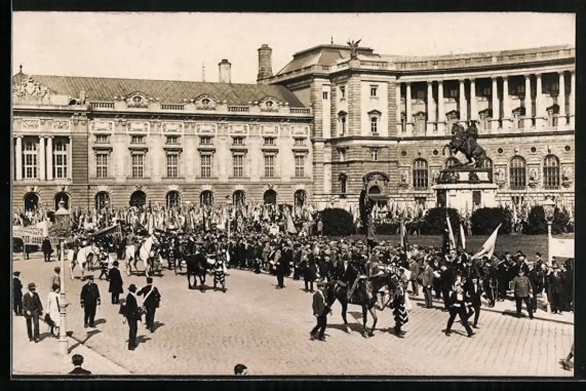 Foto-AK Wien, II. Internationaler Gesellentag, Umzug mit Reitern