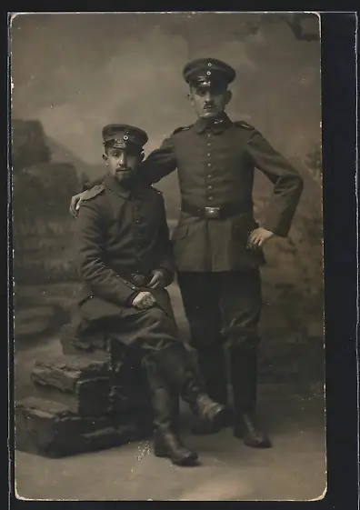 Foto-AK zwei Soldaten in Feldgrau Uniform mit Schirmmütze