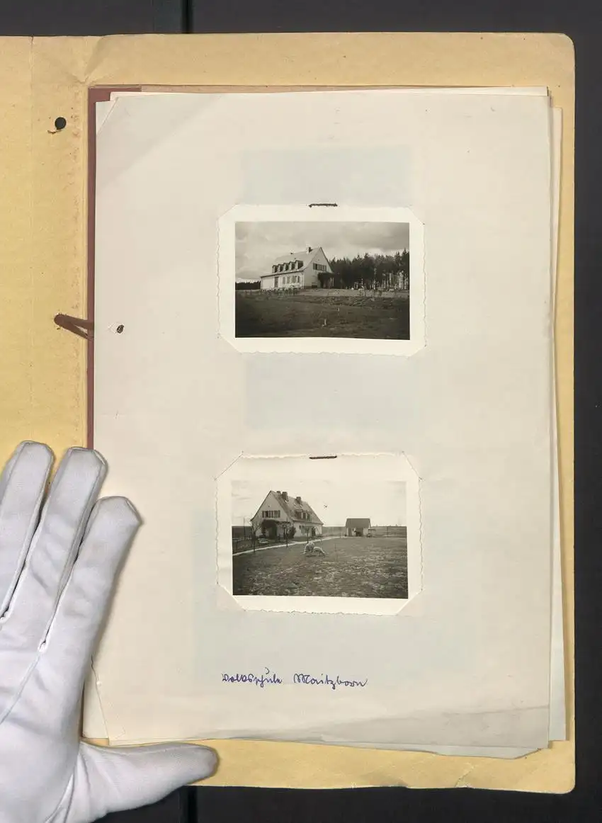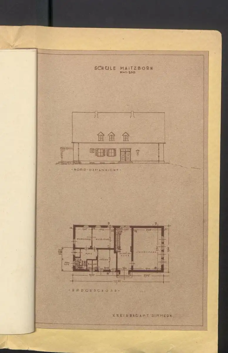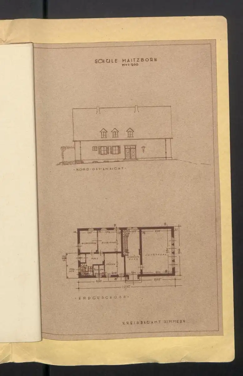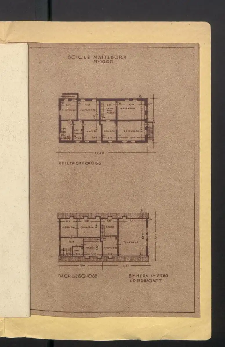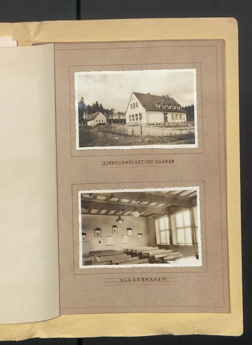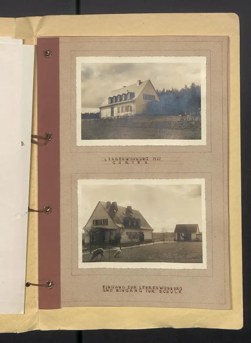 Fotoalbum mit 12 Fotografien, Ansicht Maitzborn, Volksschule Maitzborn, Lehrerwohnung, samt Grundriss der Schule 1938-39