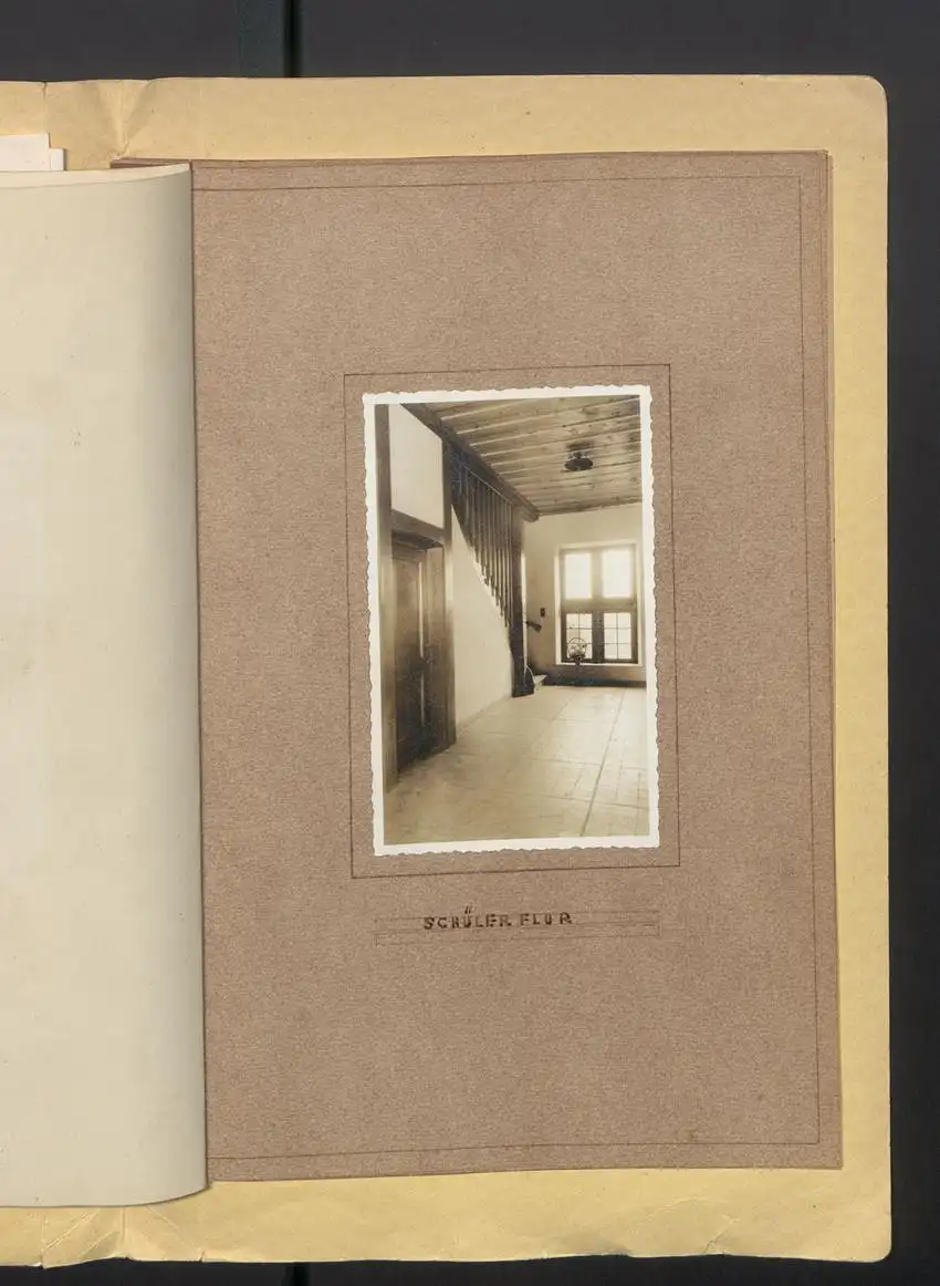 Fotomappe mit Fotografien der Volksschule Maitzborn samt Lehrerwohnhaus von 1938-1938, dem Konvolut sind beigefügt der Grundriss der Schule samt allen Etagen, Fotografien auf Trägerkarton montiert und jeweils mit Bildunterschrift versehen, guter Zustand Größe ca. 23,0 x 35,0cm