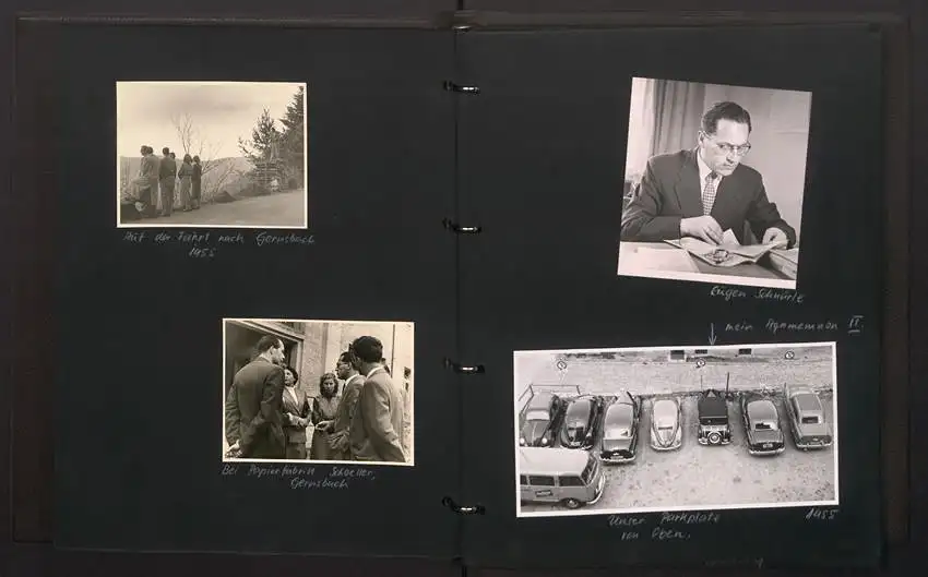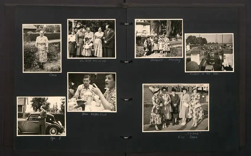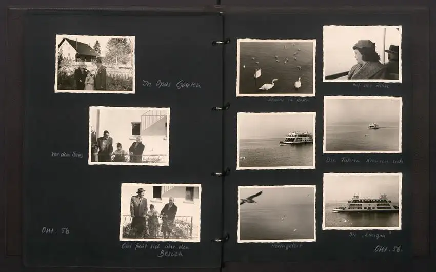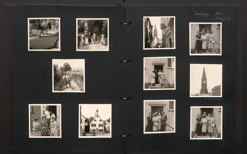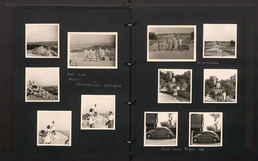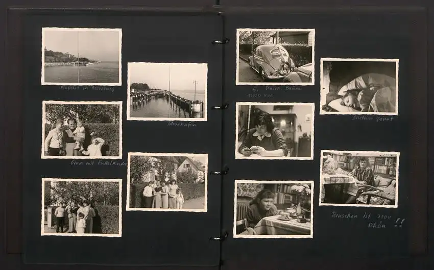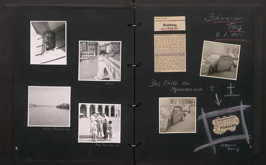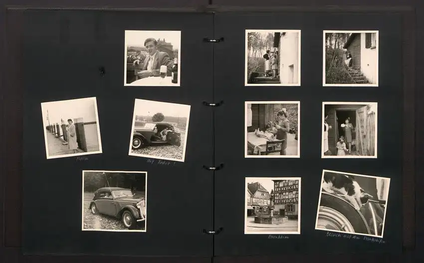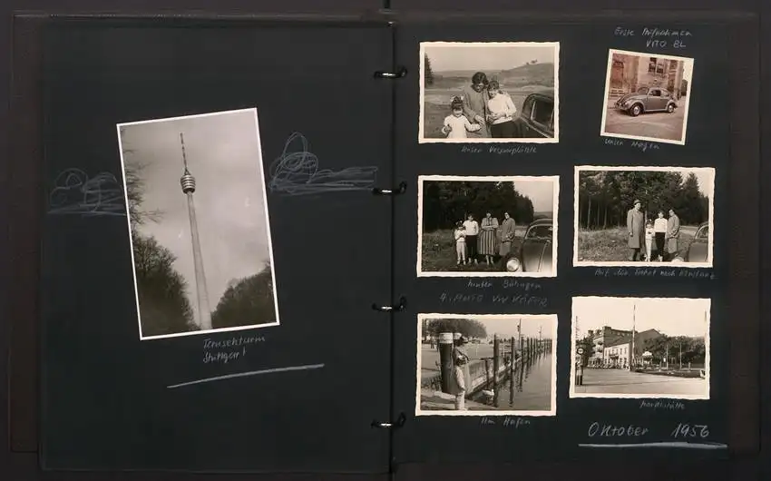 privates Fotoalbum mit 252 Fotografien zeigen eine Familie 1955-1956 in Zeiten des Wirtschaftswunder, Mitarbeiter einer Papierfabrik, auf Reisen mit DKW F7 nach Ludwigsburg, Besuch in Meersburg, Freiburg, ein Schwarzer Tag 09.08.1955 Unfall mit dem DKW "Agamemnon 2", Reise mit dem "neuen" Auto VW-Käfer, Fotografien fest im Album verklebt und mit kurzer Bildbeschreibung versehen, guter Zustand Größe ca. 25,0 x 32,0cm