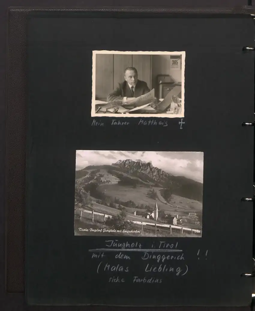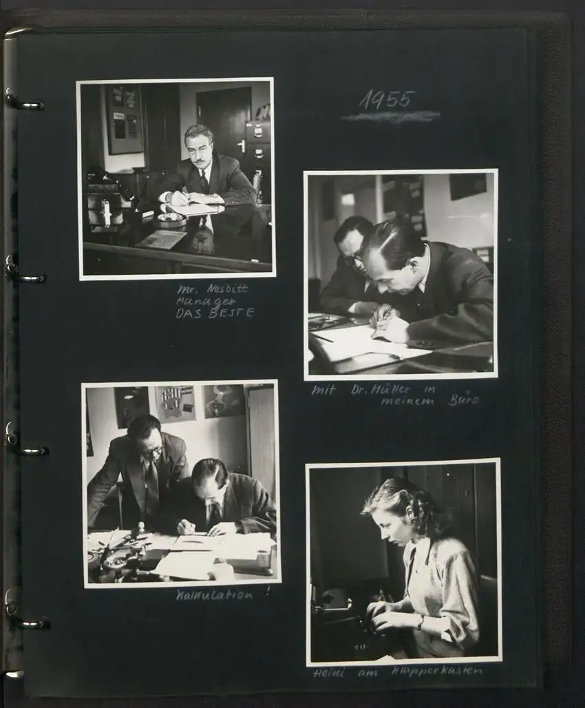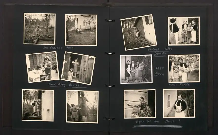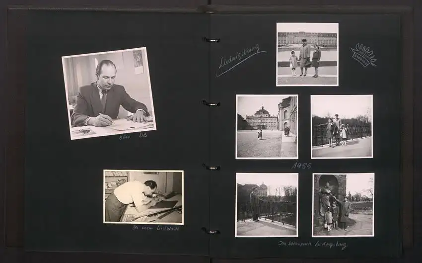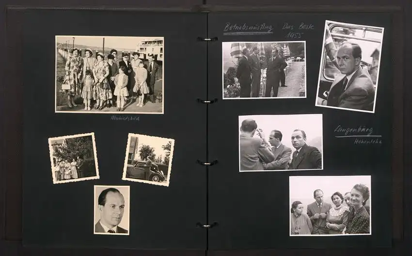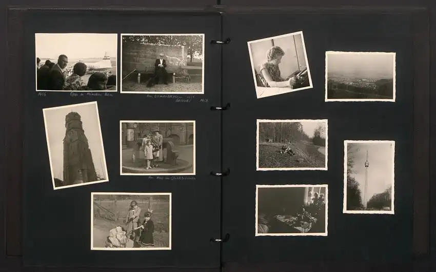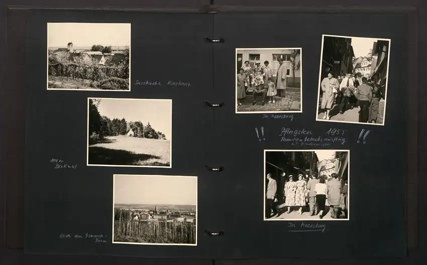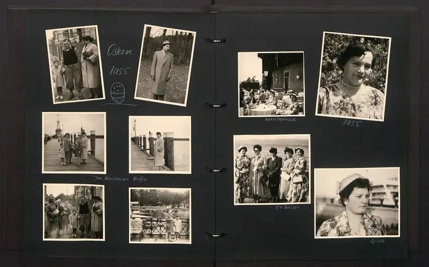 privates Fotoalbum mit 252 Fotografien zeigen eine Familie 1955-1956 in Zeiten des Wirtschaftswunder, Mitarbeiter einer Papierfabrik, auf Reisen mit DKW F7 nach Ludwigsburg, Besuch in Meersburg, Freiburg, ein Schwarzer Tag 09.08.1955 Unfall mit dem DKW "Agamemnon 2", Reise mit dem "neuen" Auto VW-Käfer, Fotografien fest im Album verklebt und mit kurzer Bildbeschreibung versehen, guter Zustand Größe ca. 25,0 x 32,0cm