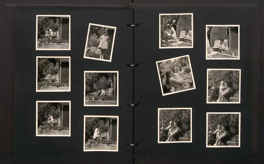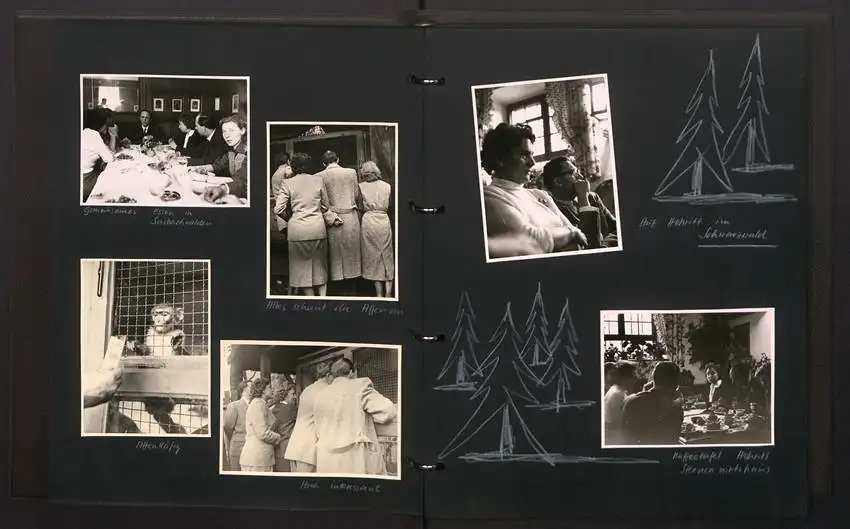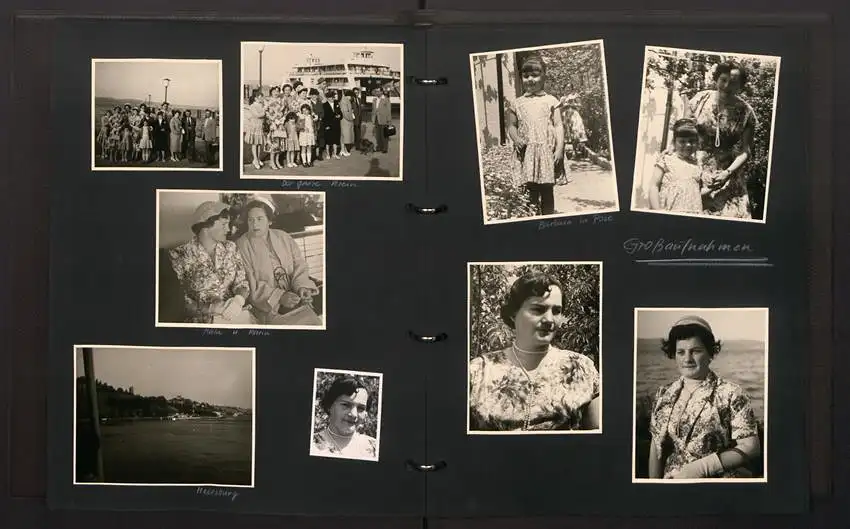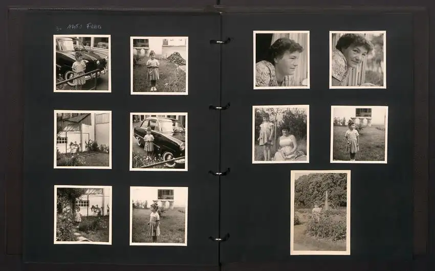 privates Fotoalbum mit 252 Fotografien zeigen eine Familie 1955-1956 in Zeiten des Wirtschaftswunder, Mitarbeiter einer Papierfabrik, auf Reisen mit DKW F7 nach Ludwigsburg, Besuch in Meersburg, Freiburg, ein Schwarzer Tag 09.08.1955 Unfall mit dem DKW "Agamemnon 2", Reise mit dem "neuen" Auto VW-Käfer, Fotografien fest im Album verklebt und mit kurzer Bildbeschreibung versehen, guter Zustand Größe ca. 25,0 x 32,0cm Fotografien ca. 8 x 8cm Gewicht: 1,7kg