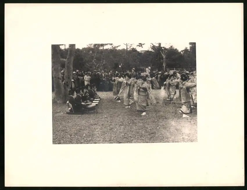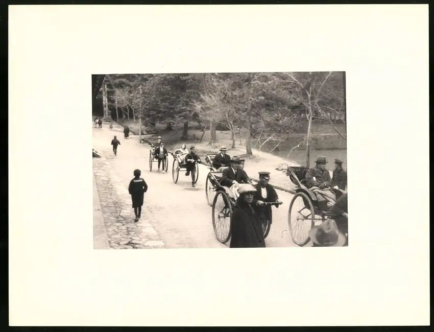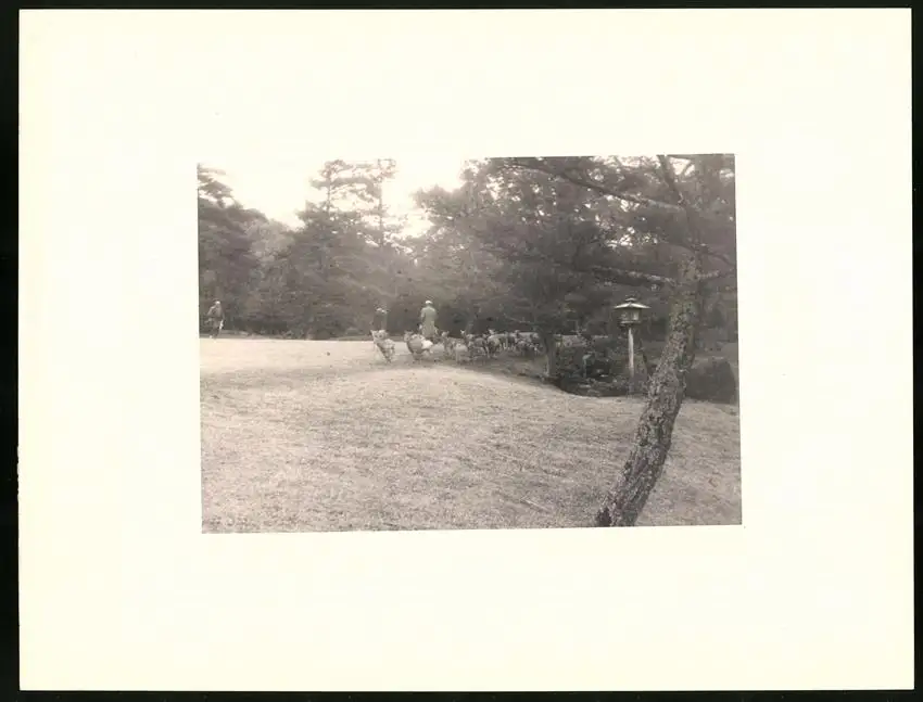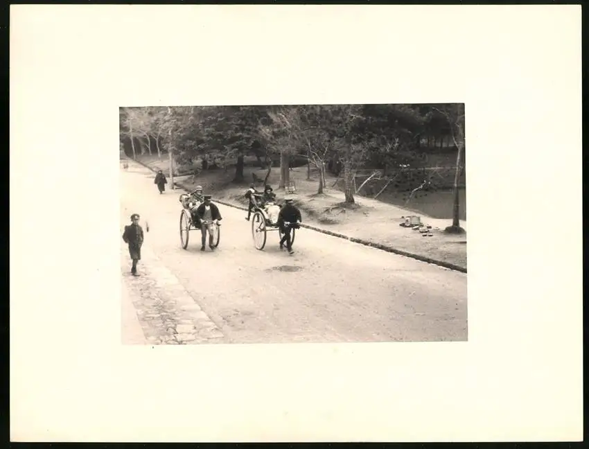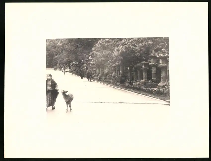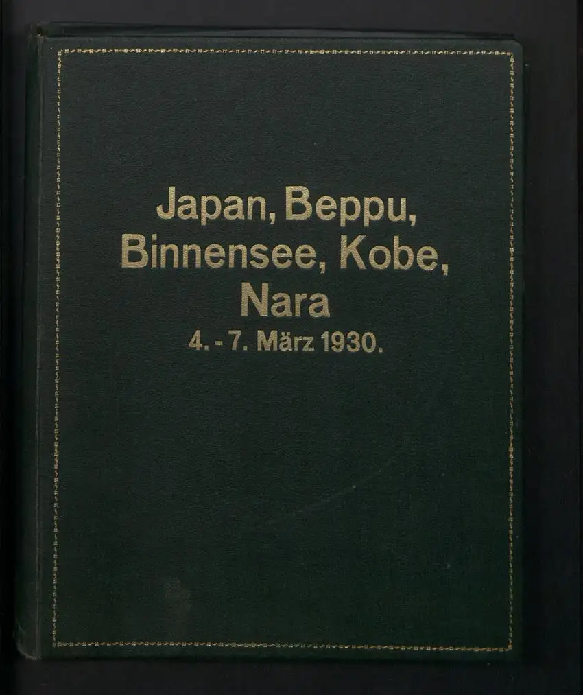 Fotomappe 4. - 7. III. 1930 mit 90 Fotogravur zeigen Japan mit Beppu, Binnensee, Kobe und Nara, Straßenleben in Beppu mit Einheimischen und Geschäften, Schulkinder empfangen die Reisenden in Beppu mit wehenden Fahnen, Landestypisches Pferdefuhrwerk, Einwohner verabschieden die Reisenden aus Beppu, schöne Eisenbahnbrücken auf der Fahrt Kobe-Kyoto, Blick auf den Todaiji Tempel in Nara, Tierpark in Nara mit den heiligen Rehen, Insel im Japanischen Binnensee, Aufgang zum Kaiserlichen Mausoleum, Schreine Tempel am Wege, Besuch in einem Japanischen Wohnhaus mit Zen Garten, Geisha Tanz im City Auditorium, Hafen Einfahr in Beppu, Heiße Quellen ( Onsen) in Beppu, Dampfer "Empress of Britain" im Hafen von Beppu, Rikscha Fahrer in Nara, Nara-no-Daibutsu, Großer Glockenturm im Tempel, Reisende bei der Wildtierfütterung im Tierpark Nara, alle Tafeln sind jeweils auf der Rückseite mit einer Bildbeschreibung und Datum versehen, Fotomappe im grünen Ledereinband und auf der Front mit golden geprägten Schruftdruck "Japan, Beppu, Binnensee, Kobe, Nara 4. - 7. März 1930" versehen, guter Zustand Größe ca. 21,0 x 16,0cm