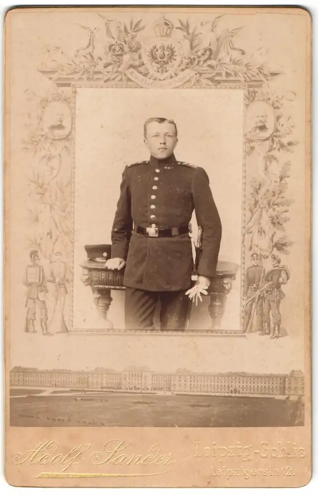 Fotografie Adolf Sander, Leipzig, Ansicht Leipzig, Kaserne des 7. köngl. sächs. Inf.-Rgt. König Georg Nr. 106, Soldat